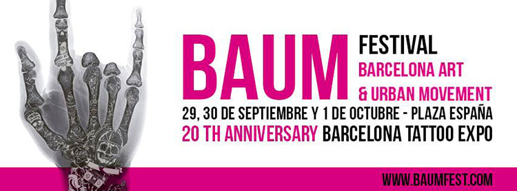 Fira de Barcelona acoge hasta el 2 de octubre BAUM Festival, dedicado a la cultura urbana donde cada año se dan cita diversas disciplinas relacionadas con el arte urbano. En su 20 edición, el tatuaje será el protagonista y más de 300 tatuadores de todo el mundo se reunirán. También se podrá disfrutar del arte sobre ruedas, danzas urbanas, graffiti, deportes extremos, etc.